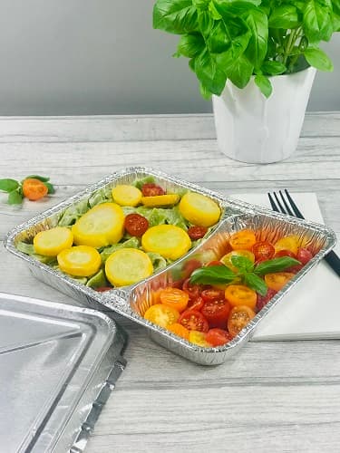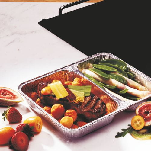 Zastosowanie: ze względu na szeroki zakres zastosowań foremki aluminiowe 2 komorowe sprawdzają się idealnie w cateringu, na stołówkach, w delikatesach, cukierniach, restauracjach i piekarniach. Pojemniki aluminiowe z wieczkiem polecane są zwłaszcza do gorących dań na wynos. Foremki aluminiowe 2 komorowe są bezpieczne w kontakcie z żywnością a aluminium chroni je przed światłem i gazami. Aluminium ma zdolność szybkiego i równomiernego przewodzenia temperatury. Tacki aluminiowe 2 komorowe sprawdzą się przy pakowaniu szerokiej gamy produktów takich jak dania gotowe, ryby, owoce morza, mięso, dania orientalne, fast food i dania na wynos. Foremki aluminiowe 2 komorowe nie wpływają na smak i zapach podgrzewanej żywności. Ze względu na fakt, że tacki aluminiowe są wytrzymałe na szeroki zakres temperatur można w nich wypiekać, przechowywać a nawet zamrażać żywność. Zaletą foremek aluminiowych jest możliwość podgrzewana żywności w mikrofali. Należy przy tym pamiętać o kilku zasadach: foremkę aluminiową należy ułożyć na środku obrotowej płyty szklanej lub ceramicznej (nie z metalu) w kuchence mikrofalowej, żywność w pojemniku aluminiowym powinna być rozłożona równomiernie, tacka aluminiowa nie powinna dotykać wewnętrznych ścianek mikrofali a na czas podgrzewania należy usunąć wieczko. Po podgrzaniu żywności w foremce aluminiowej i wyjęciu z mikrofali potrawa jest gotowa do spożycia. Ponieważ aluminium jest doskonałym przewodnikiem ciepła wszelkie ciepło w potencjalnych gorących miejscach będzie przenoszone wokół pojemnika aluminiowego, dzięki czemu można uzyskać równomierne ogrzewanie w kuchence mikrofalowej. Folia aluminiowa z którego wykonane są pojemniki 2 komorowe to produkt jednorazowego użytku całkowicie przyjazny środowisku. Podlega w 100% recyclingowi.