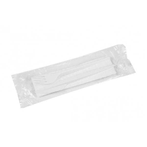 Zestaw foliowany biały widelec + nóż + serwetka - pakowane pojedynczo